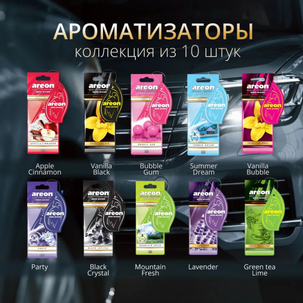 Набор из 10 ароматизаторов для машины areon, станет отличным выбором для любого автолюбителя. Он включает в себя разнообразные ароматы, которые порадуют каждого: жевательная резинка, свежесть гор, яблоко и корица, зеленый чай и лайм, вечеринка, лаванда, черная ваниль, ванильный пузырь, летняя мечта, черный кристалл. Ароматизатор в автомобиль Ареон - это не просто освежитель воздуха, это настоящий парфюм для вашего авто. Каждый аромат разработан с заботой о вашем комфорте и создает уникальную атмосферу в салоне автомобиля. Забудьте о неприятных запахах с нашей "вонючкой в машину" - пусть в вашем авто всегда будет свежо и приятно. Автоароматизатор идеально подойдет мужчине, который любит свой автомобиль. Это отличный выбор, если вы хотите подарить что-то полезное и стильное. Аксессуары для машины, такие как ароматизаторы, всегда в ходу и становятся приятным сюрпризом. Они легко впишутся в любой набор автомобилиста и станут незаменимым аксессуаром для машины. Кроме того, парфюм можно использовать не только в авто, но и как освежитель воздуха для дома. Это делает его универсальным для всех, кто ценит свежесть и уют. Набор пахучек в авто также станет отличным подарком мужчине на день рождения, парню или подруге. Ароматизаторы areon - это идеальное решение. Ваши друзья и близкие оценят практичный и стильный подарок, который будет радовать их долгое время.