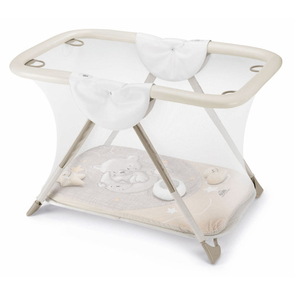 Классический манеж оригинального дизайна с прозрачными сетчатыми бортиками и игровым ковриком с приятным мягким матрасиком на дне и мягкой игрушкой в комплекте. К нему можно крепить интерактивные съемные игрушки. Манеж легко и компактно складывается книжкой.