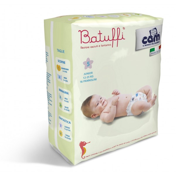 Подгузники имеют анатомическую форму, очень мягкие и удобные - ребенок может в них свободно двигаться и спать. Подгузники легко и надежно фиксируются благодаря эластичной ленте. Гипоаллергенные CAM Pannolino Batuffi клинически протестированы, подходят даже для детей с аллергией. Мягкие боковые манжеты и наполнитель - суперабсорбент, который распределен по всей площади, защищают от намокания, нежно и плотно прилегая, обеспечивают ребенку комфорт. На внешнюю поверхность подгузника нанесен забавный принт.