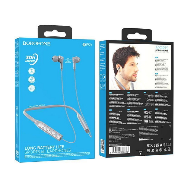 BOROFONE BE59 Rhythm - беспроводные наушники, идеально подходящие для прослушивания музыки во время занятий спортом - например в зале или во время пробежки. Корпус гарнитуры защищен от влаги, поэтому вы можете без опаски использовать ее во время дождя. Присутствует встроенный микрофон для приема звонков. Наушники имеют встроенные магниты для того, чтобы фиксироваться друг к другу и не мешать, когда вы их не используете. Основное управление производится с помощью механических кнопок, позволяющих регулировать громкость, переключать треки, отвечать на звонки. В комплект входит кабель для зарядки micro-USB и 2 комплекта запасных силиконовых амбушюр разных размеров. Время автономной работы составляет 30 часов в режиме разговора или прослушивания музыки, а зарядка занимает всего 1.5 часа.