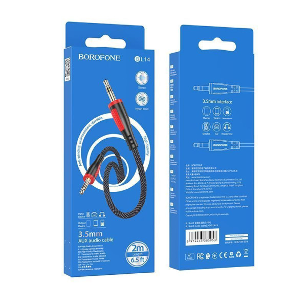 Кабель Аудио 3,5 Jack - 3,5 Jack BOROFONE BL14 длиной 1 метр, внешним материалом : 48 нитей нейлоновой тонкой оплетки, сердечник: трехжильный бескислородный медный, калибр OD3.5, 10/0.1 * 3C. Универсальный интерфейс подходит для всех стандартных AUX портов разъемом 3,5 мм. Удобно использовать в автомобиле для подключения вашего MP3 плеера или мобильного телефона к AUX -разъему.