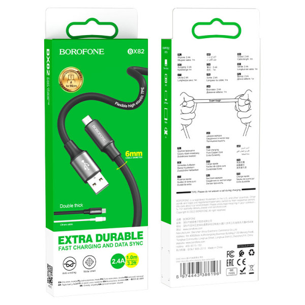 Кабель Borofone BX82 предназначен для передачи данных между гаджетами, а также их подзарядки. Подходит для устройств с разъемом MicroUSB. Кабель имеет общую силу тока в 2.4А, что позволит быстро заряжать гаджеты. Кабель покрыт крепким TPE слоем, а коннекторы имеют защиту от перегибов. Длина аксессуара составляет 1м.