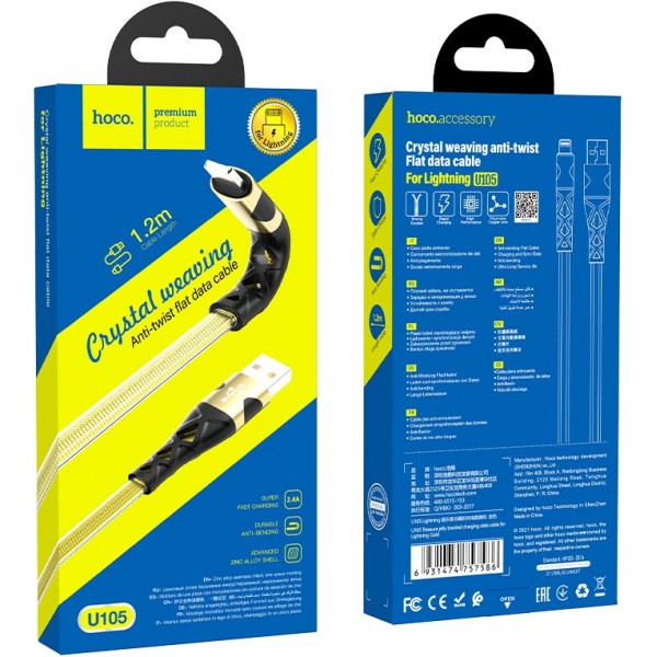 Кабель для зарядки hoco U105/ золотой/ USB на Lightning/ 1.2 метра/ Подарок мужу, жене, дочке, брату U105 Treasure, кабель для зарядки и передачи данных USB на Lightning, 1.2м, коннекторы из алюминиевого сплава и PVC оплетка, ток до 2.4A Характеристики: 1. Длина: 1.2м. Вес: 39г. 2. Внешний материал: PVC. 3. Материал коннекторов: алюминиевый сплав. 4. Сердечник: 118 жил. 5. Ток до 2.4A.