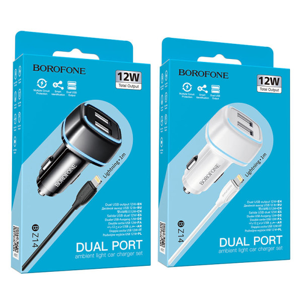 BOROFONE BZ14 автомобильное зарядное устройство с двумя USB портами, с подсветкой, набор с кабелем для iPhone