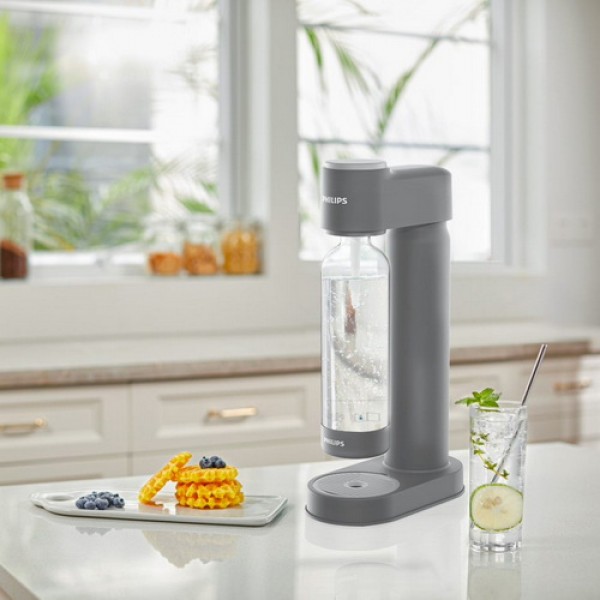 Стильный дизайн. Управление - механическая кнопка. Настройка уровня газирования. Одного цилиндра газирования хватит на 60 литров вкусной газированной воды, что заменит вам 120 одноразовых бутылок по 0,5л.