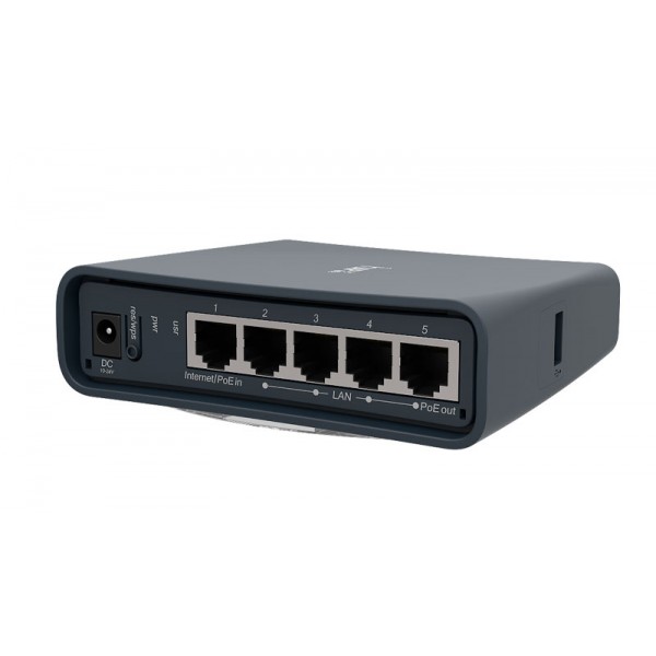 hAP ac lite может быть запитан через power jack или по технологии passive PoE через инжектор PoE. Блок питания входит в комплект. Устройство имеет функцию PoE выдачи на 5 порт - и может питать другое совместимое PoE устройство. Максимальная нагрузка на порт составляет 500mA.